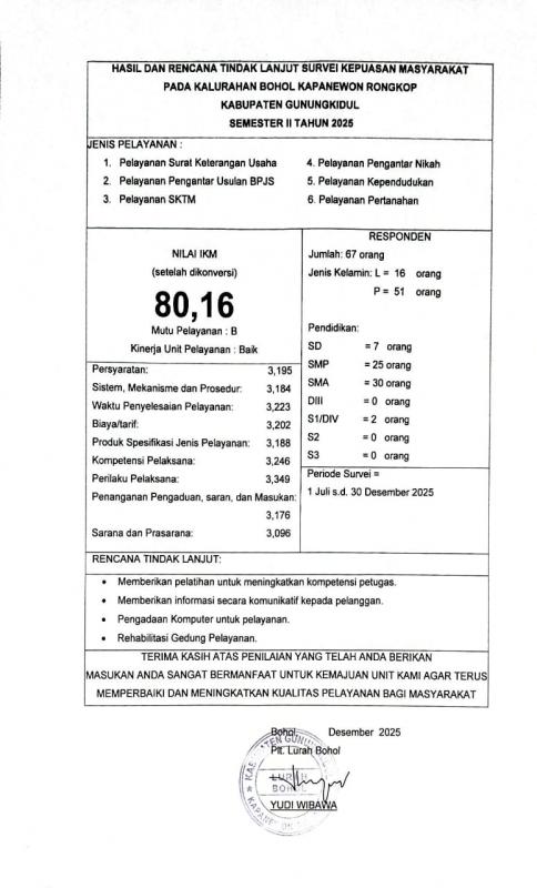 Kalurahan Bohol mengucapkan terima kasih kepada seluruh masyarakat yang telah berpartisipasi dalam survei ini. Partisipasi masyarakat merupakan bentuk dukungan nyata dalam mewujudkan pelayanan publik yang lebih baik dan berkualitas.