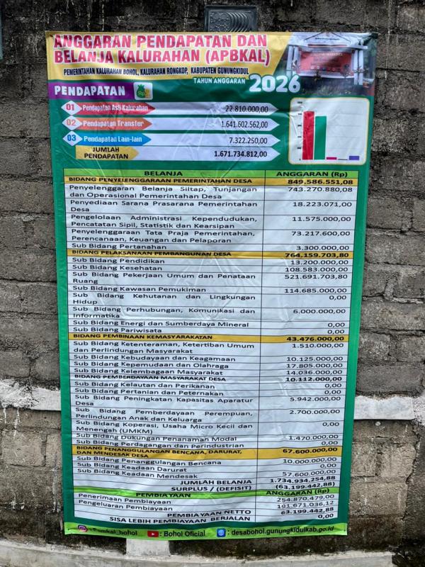 Pemasangan baleho ini merupakan wujud komitmen pemerintah kalurahan dalam menerapkan prinsip transparansi dan akuntabilitas dalam pengelolaan keuangan desa.Dalam baleho tersebut tercantum ringkasan realisasi pendapatan dan belanja kalurahan, meliputi pendapatan asli kalurahan, dana transfer pemerintah, serta penggunaan anggaran di bidang penyelenggaraan pemerintahan, pembangunan, pembinaan kemasyarakatan, dan pemberdayaan masyarakat. Selain itu, ditampilkan pula rincian APBKal Tahun Anggaran 2026 yang memuat program prioritas dan alokasi anggaran masing-masing bidang.