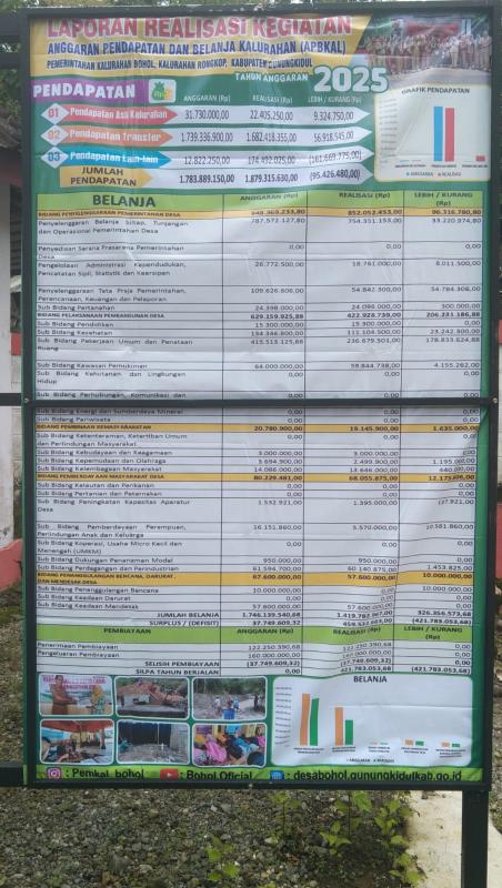 Bohol Sidasamekta, Pemerintah Kalurahan Bohol melaksanakan pemasangan baleho Laporan Pertanggungjawaban (LPJ)Tahun Anggaran 2025 dan Anggaran Pendapatan dan Belanja Kalurahan (APBKal) Tahun Anggaran 2026 sebagai bentuk keterbukaan informasi kepada masyarakat. Baleho tersebut dipasang di sejumlah titik strategis, seperti depan Balai Kalurahan, Padukuhan Songgoringgi dan Padukuhan Ngasem Kidul yang mudah diakses warga.